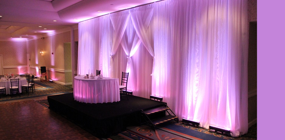 If you'r not familiar with uplighting or pipe and drape, take a look at our before and after pictures to get an idea of how some basic uplighting and pipe and drape can transform the ambience of a room. Chances are many weddings or formal events you've been to have had them. However, most halls do not provide uplighting or pipe and drape for their events. These are usually offered as a service by the event's DJ.